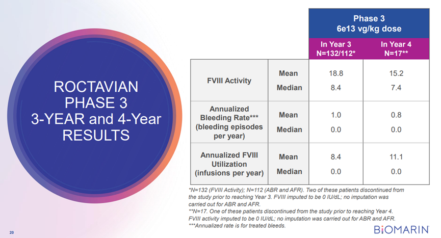 試驗結果顯示,在治療3年和4年的患者中,其凝血因子VIII的活性平均值分別為18.8和15.2,中位數值為8.4和7.4。兩組的平均年出血事件率分別為1.0和0.8,而中位值都為0.0。此外,兩組的年凝血因子平均使用次數分別為8.4和11.1,中位值也均為0。與基線值相比,在治療的第三年后,患者的平均年出血事件率減少了80%,而凝血因子VIII的使用減少了94%。