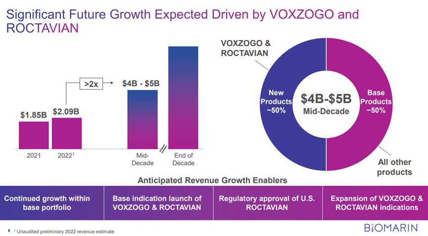Bienaimé表示,他預計超過75%的美國處方者將在上市后一年內采用Roctavian來治療嚴重的成人血友病A患者。加上Voxzogo,一種用于增加軟骨發育不全兒童(5歲及以上)線性生長的療法,Bienaimé預測到十年中期BioMarin的增長將達到40億至50億美元。