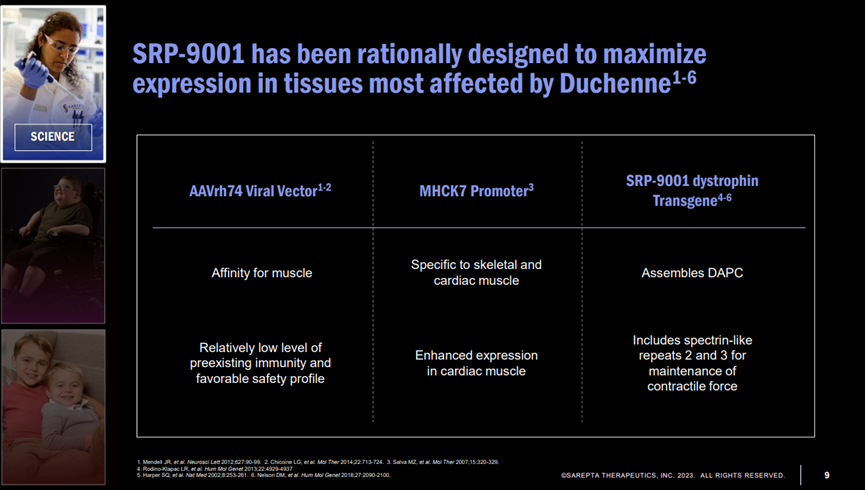 SRP-9001是通過AAV將編碼微肌營養不良蛋白的基因傳遞到肌肉組織,使肌肉細胞表達對應的蛋白,從而減緩或阻止肌肉退化。