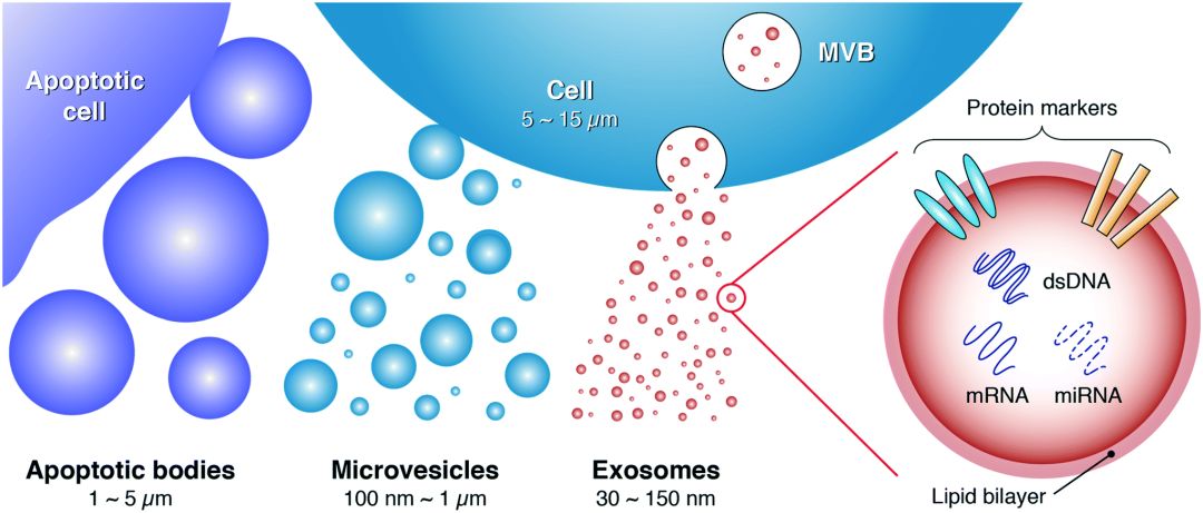 不同類型的細胞均可通過出芽方式釋放各種各樣的囊泡(如外泌體、微囊泡、凋亡小體)到細胞外,囊泡大小從40nm到毫米不等,統稱為胞外囊泡(Extracellular Vesicles,EV)。