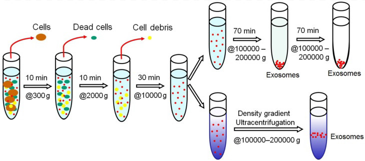 超速離心方法可獲得純EV用于科研,但在臨床上耗時長,不適合大規模生產。超速離心聚集囊泡,易于分離到可溶性因子和蛋白質。基于密度梯度的分離EV,效率最高。一些新興的技術,如尺寸排除色譜、聲學分離、納米捕捉器、流場流動分級,都有可能從不同的樣品基質中分離出EV。