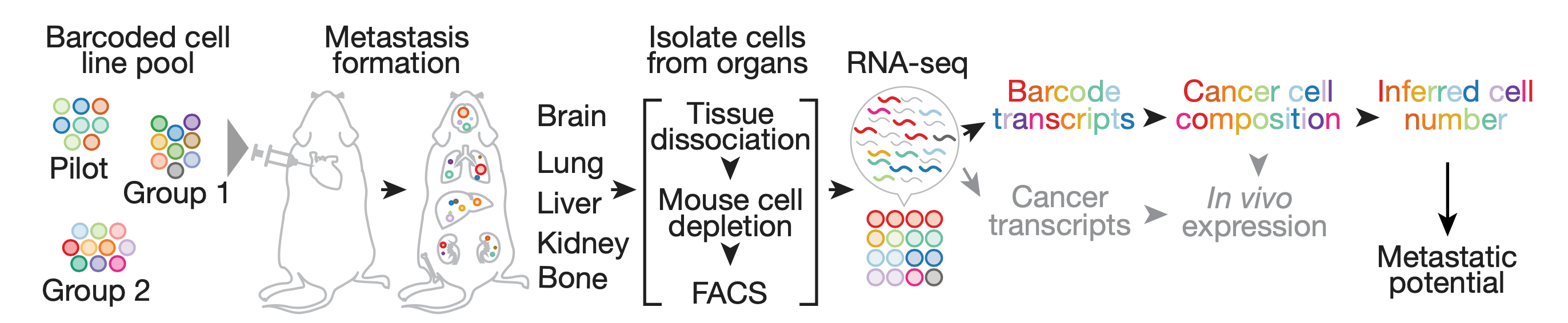 他們先給每一個癌細胞系做了DNA條形碼標記,然后將所有需要研究的癌細胞系混合在一起,注射到免疫缺陷小鼠體內。五周之后,再采集小鼠不同組織或器官的樣本,完成高通量測序,看看不同的組織或器官中各種DNA條碼的量。