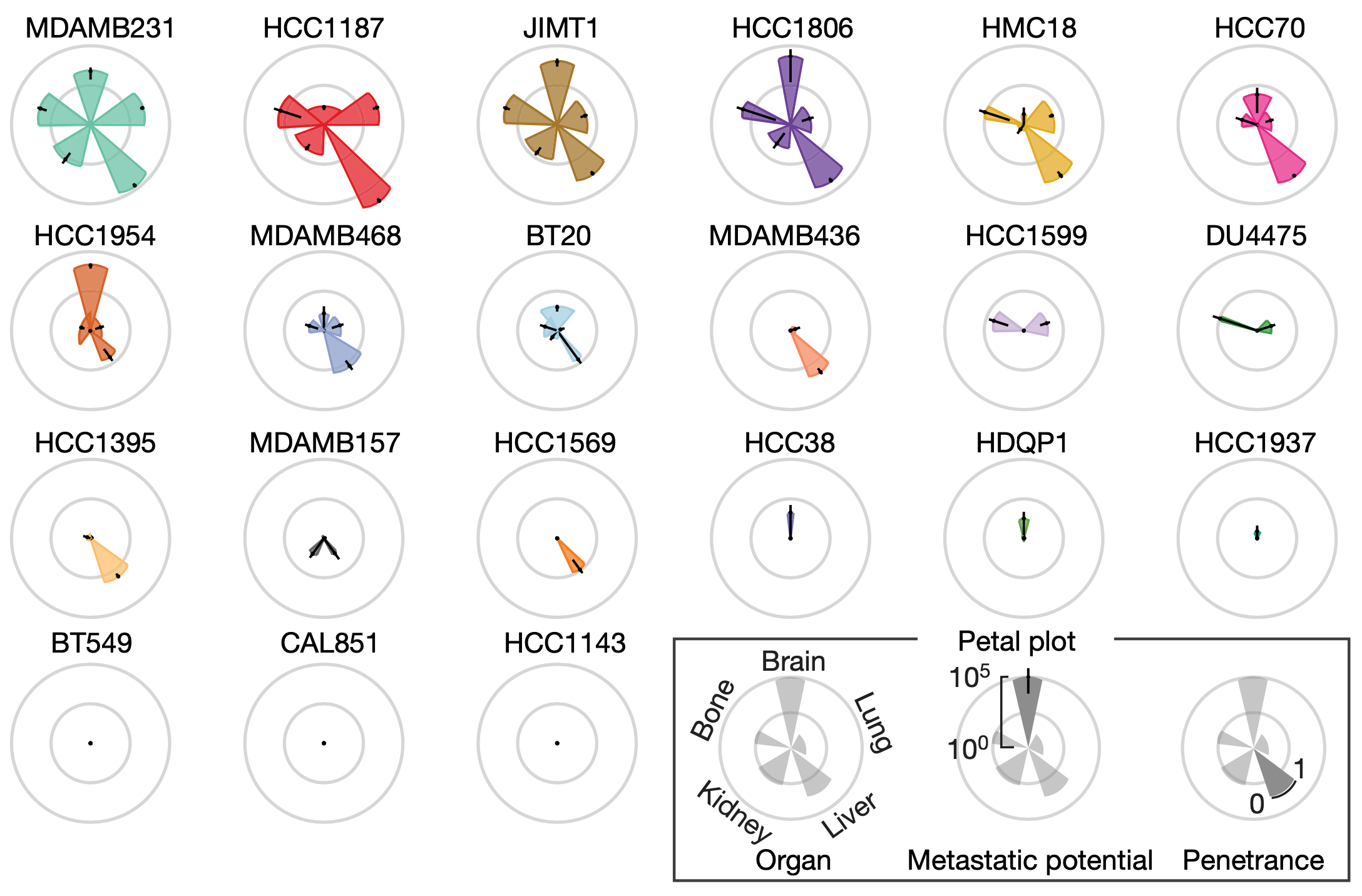 例如,MDAMB231等廣泛轉移定植,HCC1954主要入侵大腦,HCC1143等完全不轉移 。值得注意的是編號為BT20的癌細胞系,在多個器官中被檢測到,但在所有器官中的豐度都很低,這反映了它有定植能力,但沒有擴張能力。