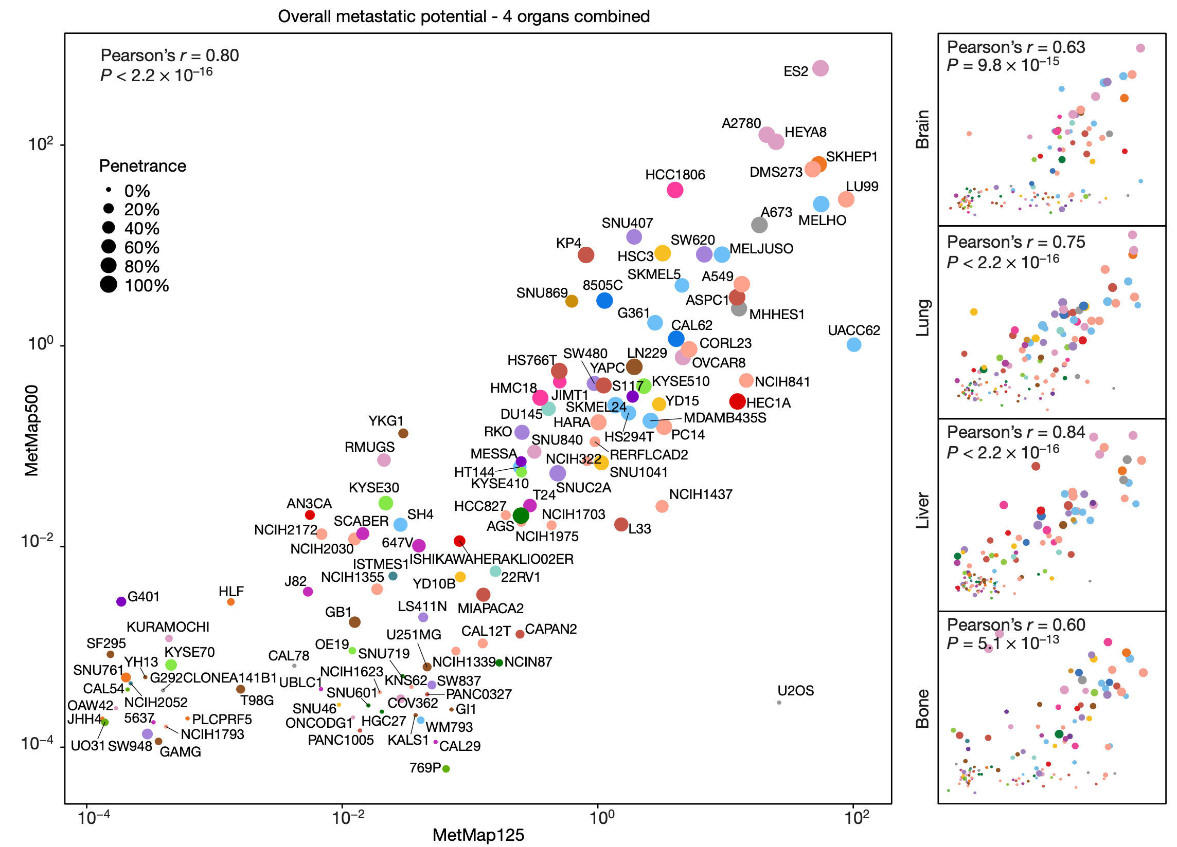 而且為了檢驗轉移圖譜數據集的穩定性,金鑫博士等還特地構建了兩種不同細胞系模式:一個是給模式小鼠一次性注射498個癌細胞系(MetMap500);另一個是注射5個癌種的各25個癌細胞系,累計125個癌細胞系(MetMap125)。