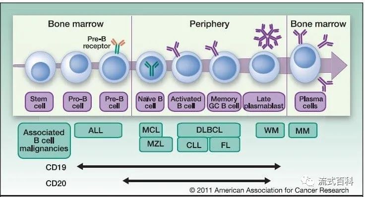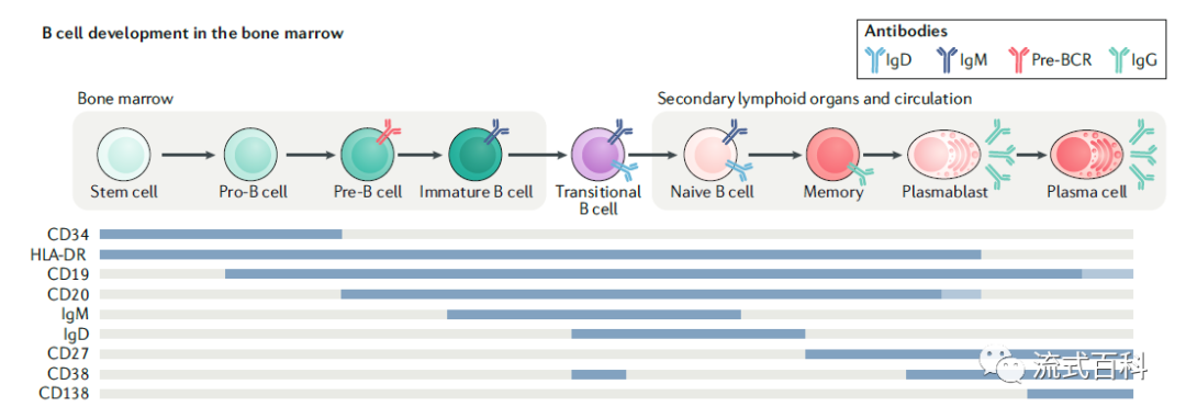 所有血液細(xì)胞的祖先都是造血干細(xì)胞。造血干細(xì)胞可以分化為髓樣干細(xì)胞和淋巴樣干細(xì)胞,淋巴樣干細(xì)胞在不同的器官中進(jìn)一步分化為NK細(xì)胞、B細(xì)胞和T細(xì)胞。其中,B細(xì)胞的分化主要在骨髓完成。經(jīng)過(guò)一系列細(xì)胞因子刺激以后,淋巴樣干細(xì)胞分化形成成熟B細(xì)胞(狹義的B細(xì)胞),進(jìn)入到血液或淋巴循環(huán)。成熟B細(xì)胞的壽命一般為2-4個(gè)月,如果成熟B細(xì)胞的增殖和凋亡失去控制,則容易演變成B細(xì)胞淋巴瘤和B淋巴細(xì)胞白血病等。成熟B細(xì)胞在外周血或淋巴中接觸外界抗原,進(jìn)一步形成能分泌抗體的漿細(xì)胞。如果漿細(xì)胞的增值和凋亡失去控制,則易引發(fā)漿細(xì)胞瘤,最常見(jiàn)的漿細(xì)胞腫瘤為多發(fā)性骨髓瘤。