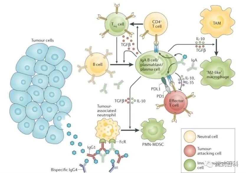 B細(xì)胞和漿細(xì)胞可能通過(guò)多種機(jī)制促進(jìn)腫瘤生長(zhǎng)。它們可以釋放免疫抑制細(xì)胞因子,如IL-10、IL-35和轉(zhuǎn)化生長(zhǎng)因子β(TGFβ)等免疫抑制細(xì)胞因子,這些細(xì)胞因子會(huì)促進(jìn)免疫抑制性細(xì)胞的“生成”,比如促進(jìn)調(diào)節(jié)性T細(xì)胞(Treg )的聚集,或是將腫瘤相關(guān)巨噬細(xì)胞(tumor-associated macrophages,TAMs)向M2型樣促腫瘤生長(zhǎng)的巨噬細(xì)胞樣極化,以及將腫瘤相關(guān)性嗜中性粒細(xì)胞轉(zhuǎn)化為髓樣抑制細(xì)胞(myeloid-derived suppressor cell, MDSC)。這些細(xì)胞因子也會(huì)抑制效應(yīng)T細(xì)胞的抗腫瘤反應(yīng),B細(xì)胞膜上PD-L1的表達(dá)也會(huì)增強(qiáng)這一抑制效應(yīng)。除此之外,B細(xì)胞也會(huì)產(chǎn)生“無(wú)效”的抗體,這些抗體不促進(jìn)抗原呈遞,也不介導(dǎo)抗體依賴性細(xì)胞毒性作用(ADCC)和吞噬作用殺傷腫瘤細(xì)胞。同時(shí)這些抗體可以與腫瘤或非腫瘤抗原形成免疫復(fù)合物,促進(jìn)慢性炎癥、組織重塑,最終誘導(dǎo)髓系細(xì)胞轉(zhuǎn)變?yōu)槊庖咭种票硇汀?/p>