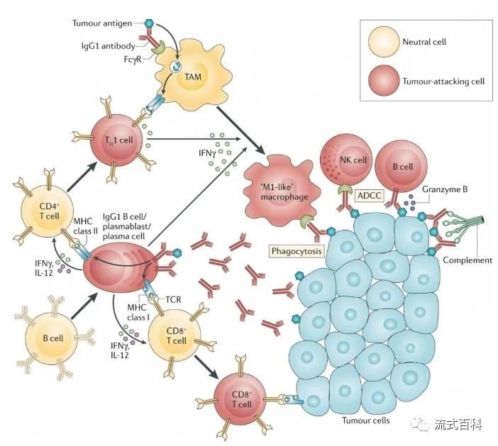 同時(shí),B細(xì)胞和漿細(xì)胞也可以通過(guò)多種機(jī)制發(fā)揮抗腫瘤免疫效應(yīng)。漿細(xì)胞分泌腫瘤細(xì)胞特異性IgG1抗體,其Fc段分別與NK細(xì)胞和巨噬細(xì)胞表面的FcγR結(jié)合,發(fā)揮ADCC和吞噬腫瘤細(xì)胞的作用。B細(xì)胞還參與向CD4+和CD8+ T細(xì)胞呈遞腫瘤抗原。首先,它們可以通過(guò)B細(xì)胞受體(BCR)直接提呈捕獲的腫瘤相關(guān)抗原,然后內(nèi)化抗原,以便有效將低濃度抗原濃縮和產(chǎn)生響應(yīng)。最近的研究表明,B細(xì)胞可能比DCs更有效地激活T細(xì)胞,以便對(duì)低濃度的顆粒抗原產(chǎn)生應(yīng)答。第二,產(chǎn)生的抗體可以支持腫瘤相關(guān)巨噬細(xì)胞和DCs對(duì)腫瘤抗原的攝取。此外,B細(xì)胞可能通過(guò)釋放細(xì)胞因子比如IFN-γ和IL-12驅(qū)動(dòng)細(xì)胞毒性免疫反應(yīng)從而促進(jìn)抗腫瘤免疫。B細(xì)胞也可以通過(guò)顆粒酶B(granzyme B,GzmB)等直接攻擊腫瘤細(xì)胞。