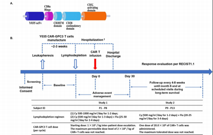 在這項研究中,研究人員對患有晚期GPC3+HCC(Child-Pugh A)的成年患者在環磷酰胺(cyclophosphamide)和氟達拉濱(fludarabine)誘導的淋巴細胞清除后,接受自體CAR-GPC3 T細胞治療,并評估這種療法的有效性和安全性。