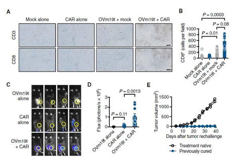 研究分析表明,CD19-CAR T細胞介導的腫瘤殺傷還誘導了垂死的腫瘤細胞釋放病毒,從而傳播了CD19t的腫瘤表達。而且,用溶瘤病毒和CAR T細胞組合治愈的癌癥小鼠表現出保護性抗腫瘤免疫力的延長。這說明,免疫系統建立了對腫瘤的記憶反應。