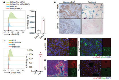 為了找到針對衰老細胞的抗原,研究人員分析了衰老的人和小鼠細胞中發現的跨膜蛋白的表達。對先前發表的關于人類組織中蛋白和RNA表達的數據進行的檢查顯示,uPAR要么未被檢測到,要么,在人體的大部分器官(包括中樞神經系統、心臟和肝臟)中以低水平存在。然而,研究人員發現uPAR在體內和體外衰老細胞中都有高表達。有趣的是,缺乏跨膜區域的一種可溶性uPAR (suPAR)是SASP反應期間分泌的一種成分。suPAR的存在是一些慢性疾病的標志,包括糖尿病和腎病 ,衰老在這些疾病中起作用。