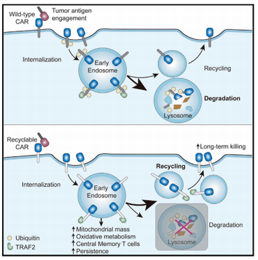 機制性探索發現,改造后的CAR在T細胞中循環(recycling),并在激活后富集在胞內內體(endosome)中,其胞內段4-1BB結構域仍然結合著信號傳遞分子TRAF2,在胞內執行信號傳遞功能,因而增強了4-1BB下游信號,促進了T細胞的代謝重編程(提高線粒體的生成及氧化磷酸化代謝)及中央型記憶T細胞的分化。研究團隊將這種全新的設計命名為可循環CAR(Recyclable CAR)。這些結果為后續可循環CAR的臨床驗證提供了堅實的基礎。