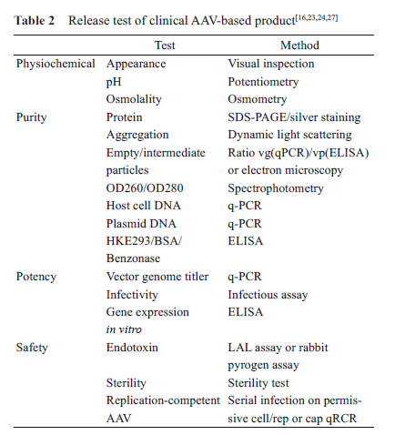 rAAV病毒生產(chǎn)質(zhì)量控制包括過程控制與終產(chǎn)品放行檢測(表2)。