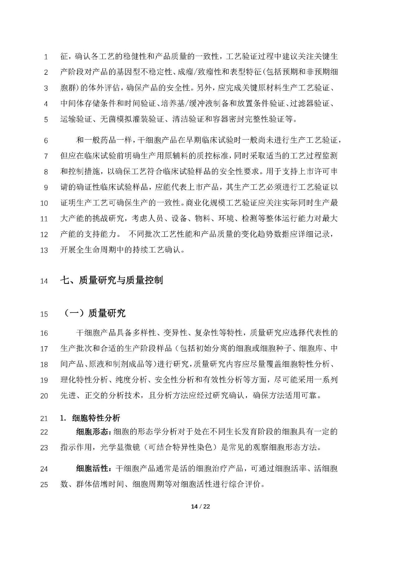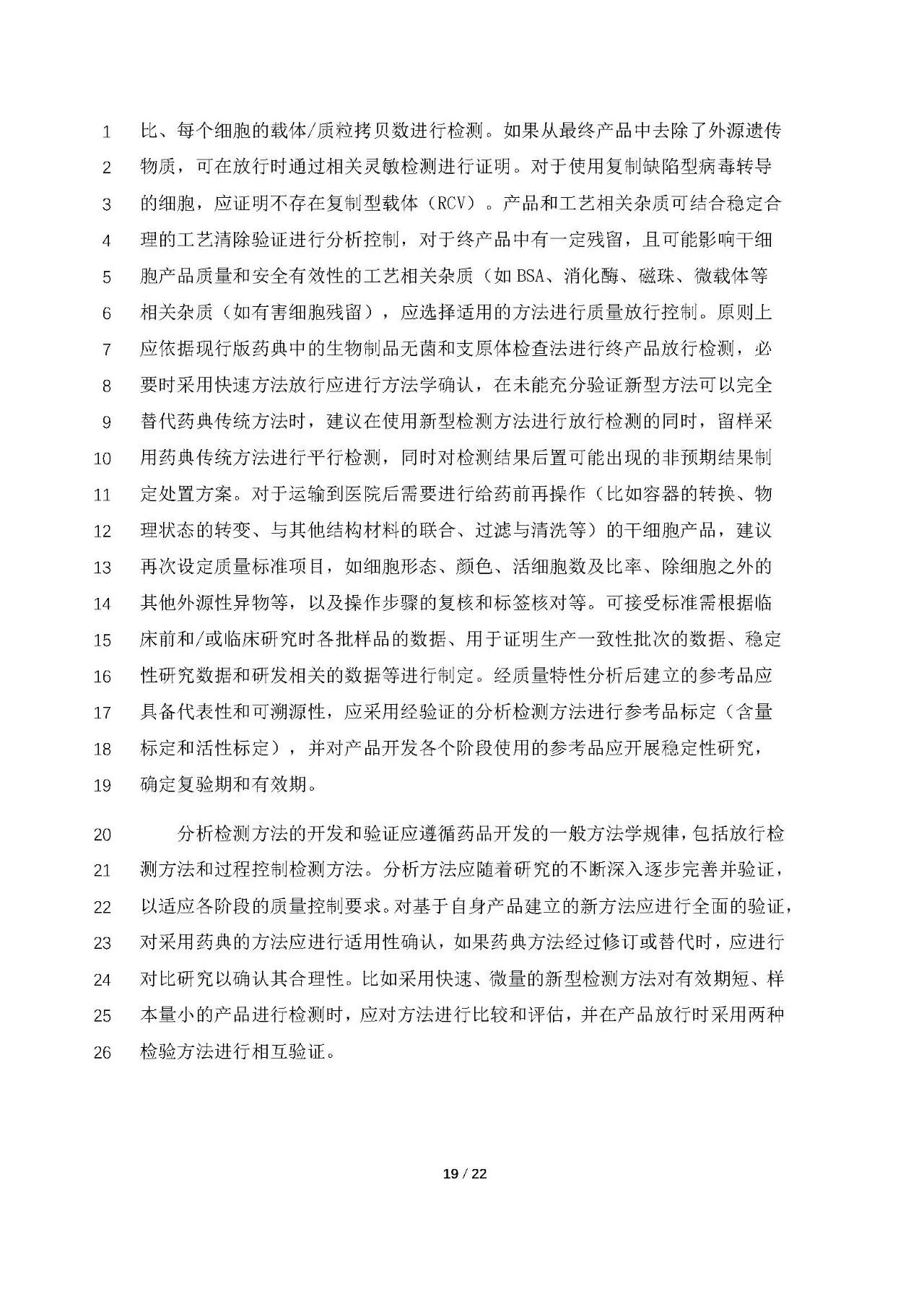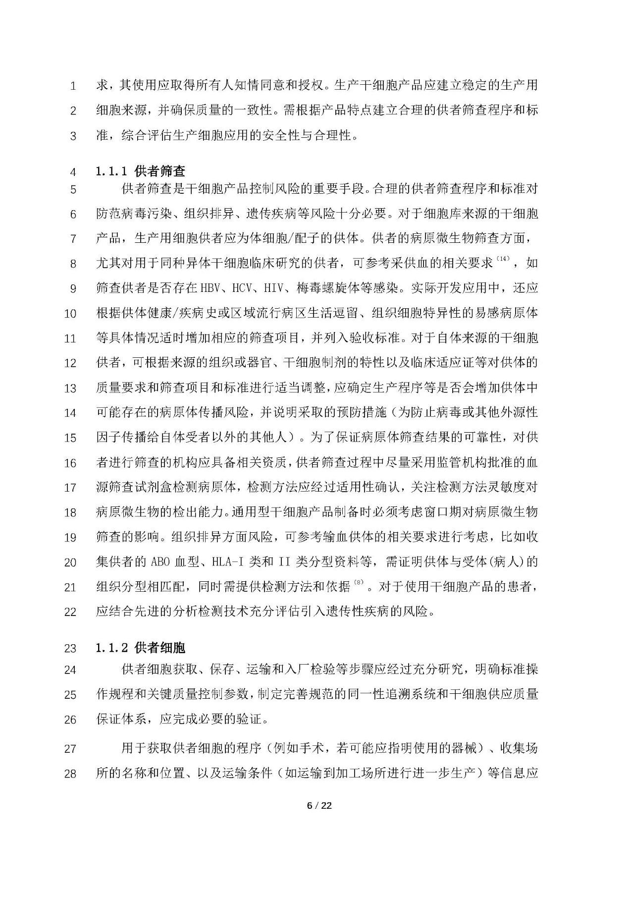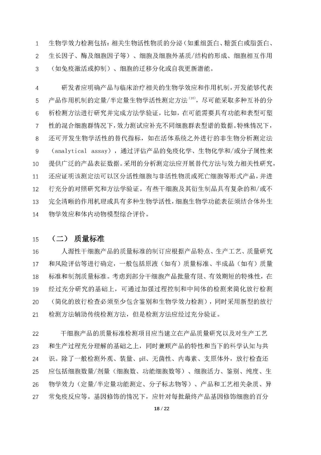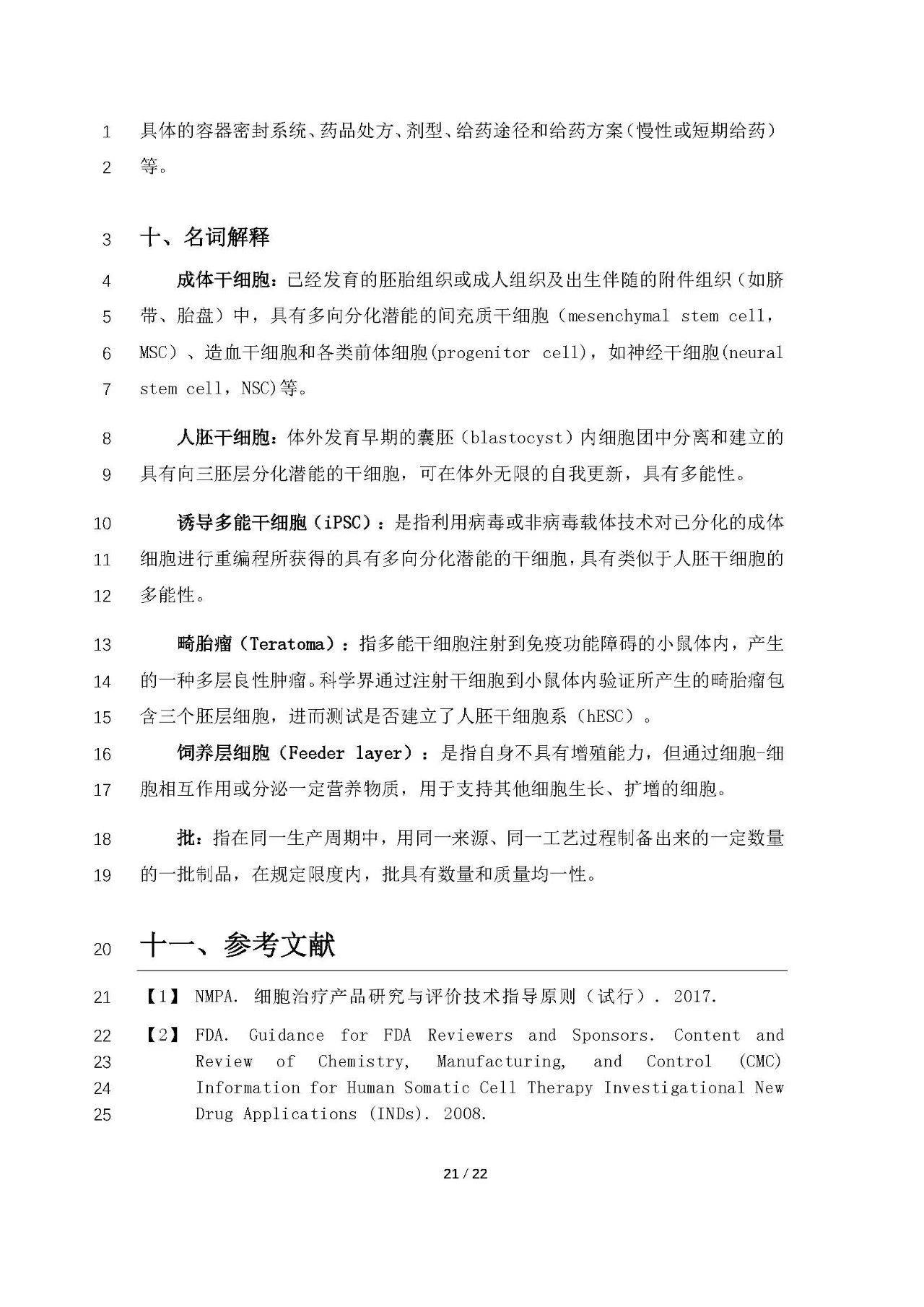 適用范圍:本指導原則中“干細胞產品”包括由人源性的成體干細胞(adult or somatic stem cells,ASCs/SSCs)、人胚干細胞(human embryonic stem cell, hESCs) 和誘導性多能干細胞(induced pluripotent stem cells,iPSCs)擴增、誘導分化,或成熟體細胞轉(分)化獲得的干細胞及其衍生細胞,與輔料相混合,分裝至特定容器,符合特定藥品放行標準,可直接應用患者,也可與組織工程材料 一起用于患者的治療產品。