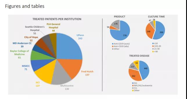 目前,在所有CAR-T研究機構中,賓夕法尼亞大學接受了大多數的患者;細胞的靶點通常是CD19 ,起源產品主要是自體T細胞;大多數CAR-T細胞產品的制造時間在14天;CAR-T細胞療法主要用于治療血液系統惡性腫瘤。