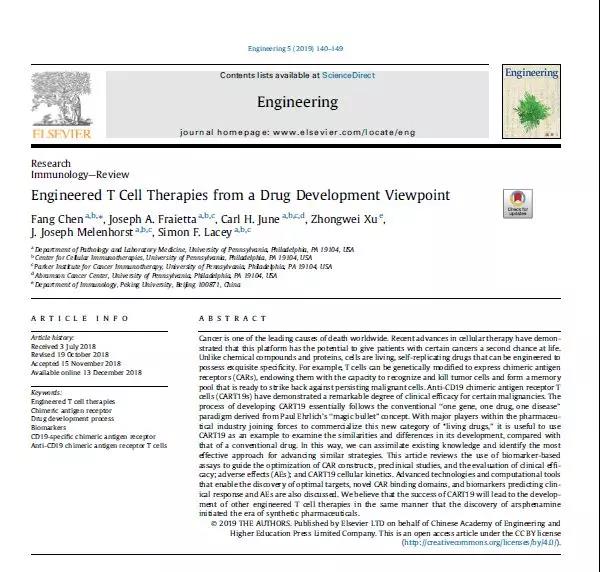 北京大學免疫系客座教授、貝賽爾特首席科學家許中偉教授與其原領導賓夕法尼亞大學Carl June教授及其課題組聯合撰寫的綜述文章“Engineered T Cell Therapies from a Drug Development Viewpoint”,于2019年2月在中國工程院主編的“Engineering”英文版(Volume 5,lssue1,February 2019,Pages 140-149)發表。該論文主要以CD19-CAR-T細胞藥物為例,從藥物開發角度看基因工程T細胞的設計和應用評定。